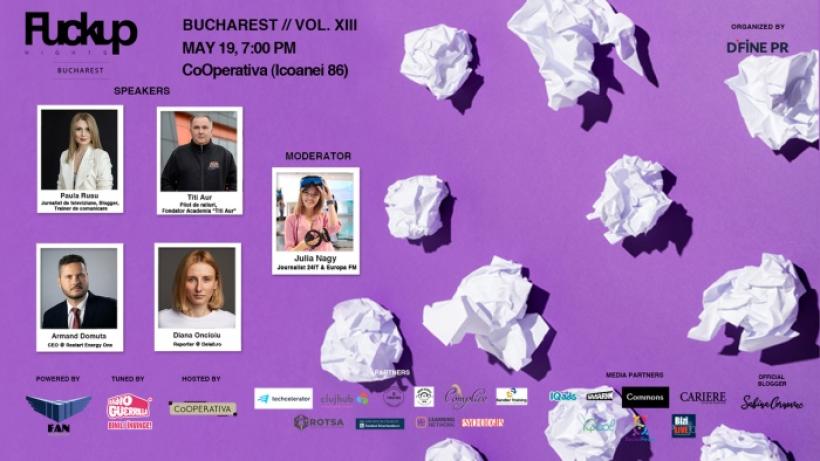 Titi Aur – pilot de raliuri, Armand Domuță - CEO Restart Energy One, Diana Oncioiu – reporter, jurnalist independent, Paula Rusu - jurnalist și blogger vorbesc despre eșec, cum l-au depășit și ce au învățat, dar și despre provocările în carieră la a XIII-a ediție a Fuckup Nights Bucharest.