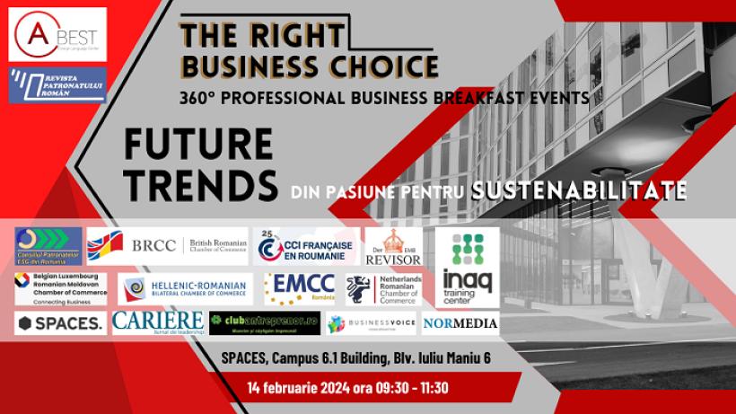 „Future Trends. Din pasiune pentru sustenabilitate” continuă seria de evenimente „360 professional business breakfast events” ca parte din proiectul de comunicare „The Right Business Choice” – serie de evenimente business offline, ajunsă la ediția cu numărul 5 și serie de emisiuni video difuzate online, care au ajuns la ediția cu numărul 30.