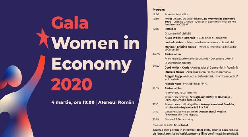 În prezența Excelenței Sale, Președintele României, domnul Klaus Iohannis și a domnului prim-ministru interimar, Ludovic Orban, pe 04 martie 2020, la Ateneul Român, începând cu ora 19:00, doamnele din lumea afacerilor vor fi premiate în cadrul Galei “Women in Economy” 2020.
