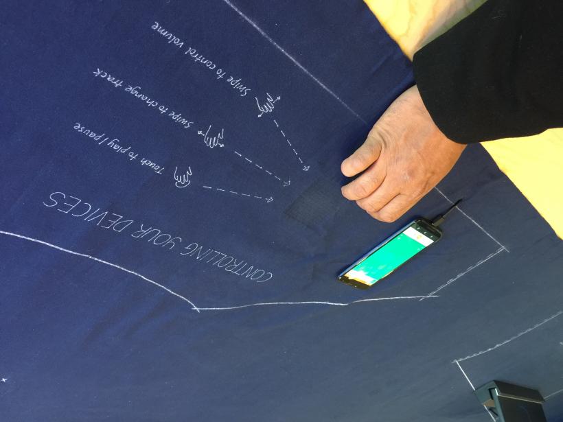 În momentul demonstraţiei, mai mulţi oameni controlau lumini sau ecranele calculatoarelor doar prin atingerea cu degetul a unei bucaţi de material albastru de pe masă.