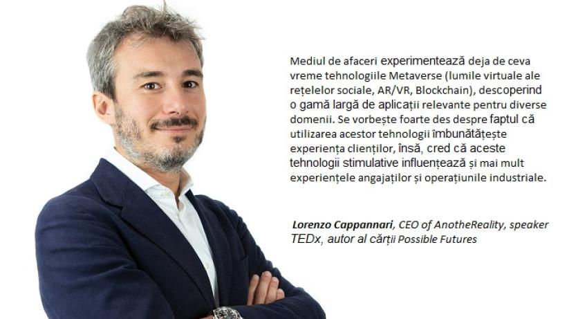 Lorenzo Cappanari: Mediul de afaceri experimentează deja de ceva vreme tehnologiile Metaverse (lumile virtuale ale rețelelor sociale, AR/VR, Blockchain), descoperind o gamă largă de aplicații relevante pentru diverse domenii. Se vorbește foarte des despre faptul că utilizarea acestor tehnologii îmbunătățește experiența clienților, însă, cred că aceste tehnologii stimulative influențează și mai mult experiențele angajaților și operațiunile industriale.