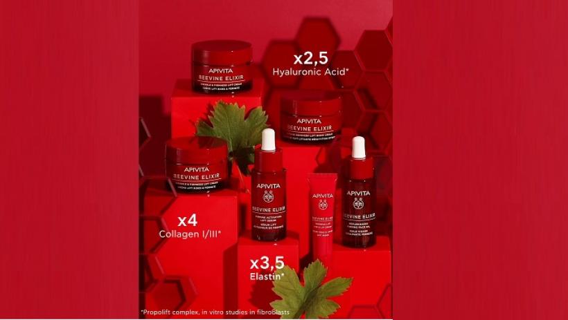 Gama APIVITA BEEVINE ELIXIR este rezultatul unei noi tehnologii patentate și are în centrul ei complexul PROPOLIFT la care se adaugă o infuzie de colagen vegetal, pentru ca ea să poată oferi o soluție inovatoare de estompare a ridurilor și de îmbunătățire