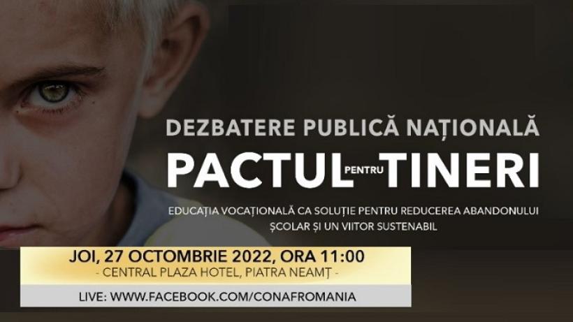 Confederația Națională pentru Antreprenoriat Feminin (CONAF)*, va organiza în data de 27 octombrie 2022 la Piatra Neamț a doua dezbatere a proiectului național „Pactul pentru Tineri”, în parteneriat cu Ministerul Educației, Ministerul Familiei, Tineretului și Egalității de Șanse, Ministerul Muncii și Solidarității Sociale, UNICEF și Banca Mondială.