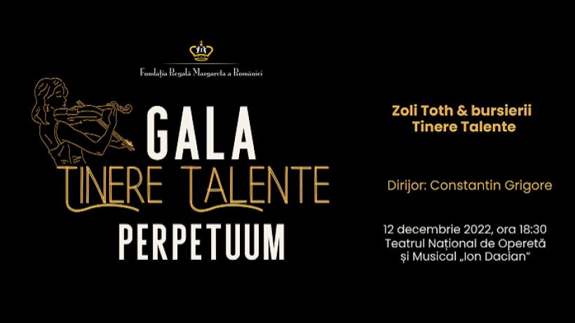 În prezența Alteței Sale Regale Principesa Sofia, concertul „Perpetuum” îi va reuni pe bursierii Tinere Talente, alături de Zoli Toth și dirijorul Constantin Grigore, pe scena Teatrului Național de Operetă și Musical „Ion Dacian”, într-o incursiune sonoră din canonul universal al muzicii clasice, cu elemente moderne. Artist conceptual, muzician, antreprenor, realizator de programe radio, profesor de percuție și mentor în programul Tinere Talente, Zoli Tóth va susține, alături de tinerii muzicieni, momentul artistic de pe scena Galei de anul acesta, pentru care a și realizat programul muzical, ce are la bază lucrări celebre din repertoriul compozitorilor W.A. Mozart, M. Musorgski, S. Rachmaninov, Eduardo di Capua, G. Bizet și G. Verdi, lucrări ce i-au inspirat pe Eric Carmen, Aaron Schroeder, Gary Brooker, Keith Reid sau Matthew Fisher. Tinerilor muzicieni li se vor alătura pe scenă doi invitați speciali ai Galei: tenorul George Vîrban și soprana Miruna Iancu. Cei doi au fost bursieri Tinere Talente ai generațiilor anterioare, astăzi nume cunoscute ale scenelor naționale și internaționale.