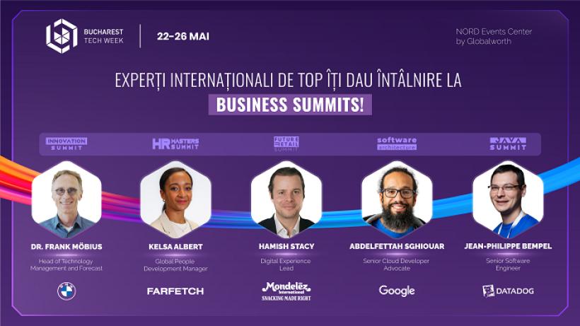 Între 22 și 26 mai, Bucharest Tech Week organizează cinci summituri de business nișate, pe arii precum Inovație, HR, Retail, Java și Software Architecture, găzduite de NORD Events Center by Globalworth. Summiturile vor fi formate din masterclass-uri și sesiuni tematice interactive, ce oferă participanților oportunitatea de a beneficia de cunoștințe și exemple de bune practici de la speakeri internaționali, cunoscuți experți și inovatori în diverse arii de activitate. Totodată, numeroase companii de top vor prezenta soluții și exemple inovatoare din industria lor, în zona expo adiacentă fiecărui Summit.