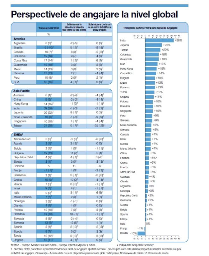 Cercetarea ManpowerGroup referitor la doilea trimestru al anului relevă faptul că în 39 din 42 de țări și teritorii angajatorii se așteaptă să-și sporească numărul total de angajați în intervalul aprilie – iunie 2016. Cu toate acestea, chiar dacă nu există semne că piața muncii s-ar putea contracta, în cele mai multe țări și teritorii intențiile de angajare continuă să rămână modeste. De fapt, în unele piețe cheie ale muncii, cum ar fi Germania, Franța și Italia, tendințele de îmbunătățire se luptă încă să prindă rădăcini, pe fondul incertitudinii economice actuale. Ținând cont de turația încetinită a economiei din China și de turbulențele de pe piețele de mărfuri, majoritatea angajatorilor din întreaga lume par a fi adoptat o abordare măsurată de suplimentare a personalului doar când este realmente necesar.