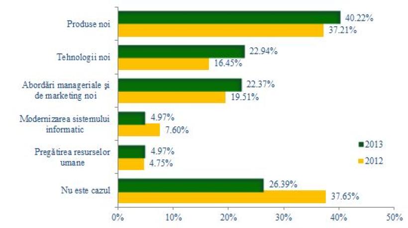 Din perspectiva structurala, s-au constat urmatoarele modificari semnificative: cresterea ponderii optiunilor reprezentate de noile tehnologii (+6,49%), noile produse (+2,99%) si abordarile manageriale si de marketing noi (+2,86%), precum si reducerea propensiunii de a investi in modernizarea sistemului informatic (-2,62%).