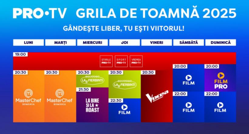 - „MasterChef România 2025” – din 8 septembrie, Chef Sorin Bontea, Chef Florin Dumitrescu și Chef Cătălin Scărlătescu revin cu dueluri culinare tensionate și un premiu de 75.000 de euro.