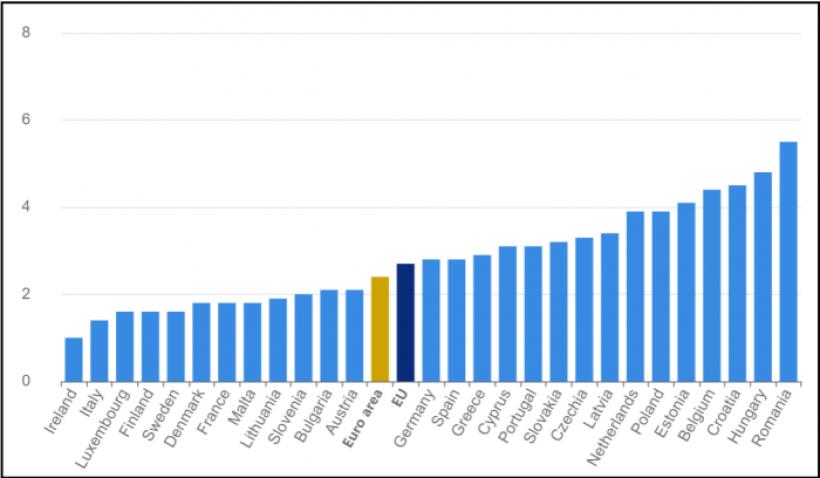 Pe de altă parte, cele mai scăzute rate anuale ale inflației au fost înregistrate în Irlanda (1,0%), Italia (1,4%) și în grupul format din Luxemburg, Finlanda și Suedia (1,6%).