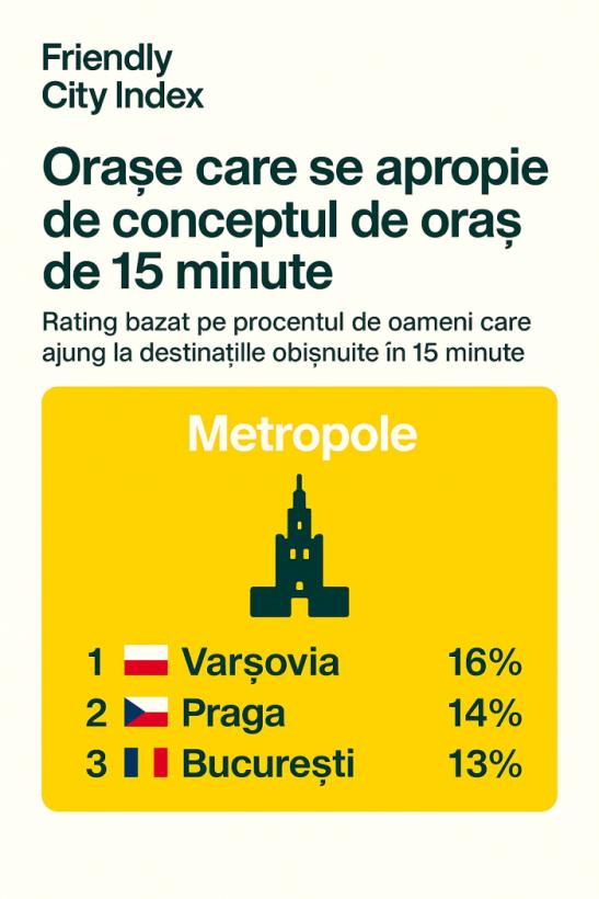 În cazul Bucureștiului, 45,89% dintre respondenți au declarat că ajung în până la 30 de minute la destinațiile principale, iar doar 13,04% consideră că locuiesc într-un oraș de 15 minute. Totuși, Capitala este plasată în top trei orașe mari cel mai aproape de acest deziderat, după Varșovia (15,86%) și Praga (13,82%).